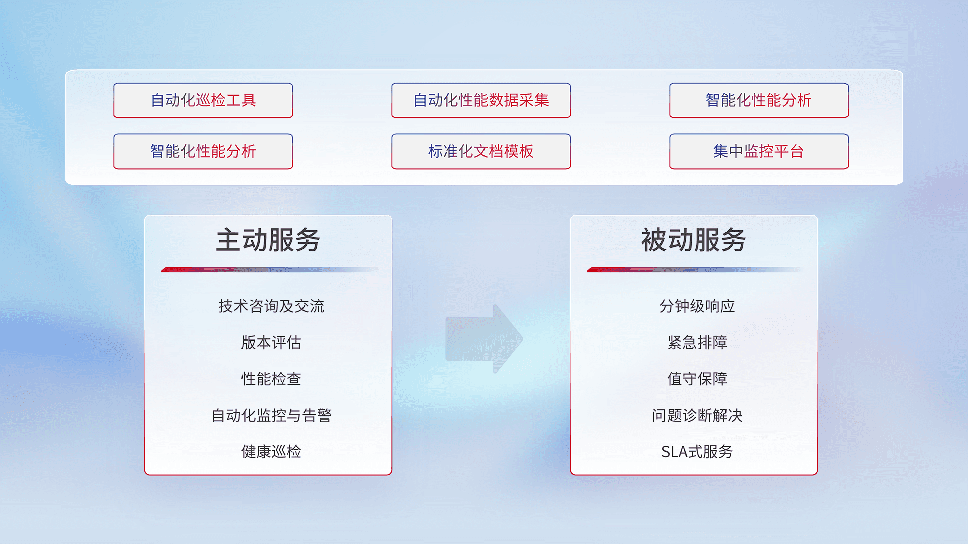 智能化工具和标准化文档,,,,保障服务质量,,,提供主动服务(包含技术咨询、、、、版本评估、、、性能检查、、自动化监控与告警、、健康巡检)和被动服务包含(分钟级响应、、、、紧急排障、、、值守保障、、、问题诊断解决、、、SLA服务)。。。